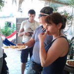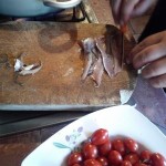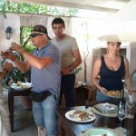 Ringraziamo innanzitutto il padrone di casa Giuseppe Ippolito (Seppetto per gli innumerevoli amici) per la sua enorme disponibilità ed ospitalità, conosciuta ed apprezzata da tutti quelli che hanno la fortuna di frequentare casa sua e ringraziamo Elena, una meravigliosa giovane signora che è la preziosa ed insostituibile cuoca di casa Ippolito. Elena si muove rapidissima e sicura, inventando ogni giorno nuove ricette a seconda di quello che trova in cucina, dove non mancano mai, specialmente in estate, i pomodorini con cui si cucina e si prepara il sugo, i peperoni, le melanzane, le zucchine, la cipolla di Tropea, l’aglio locale a treccia, basilico fresco, prezzemolo, sedano e pesce freschissimo, non importa quale, basta che sia fresco perchè è cosi’ che si mangia a casa Ippolito, prodotti del territorio e di stagione, genuini ed a chilometro zero (tranne i gamberetti). E quando i numerosi ospiti di casa cioè amici vari, importatori di vino, enologi, provenienti da ogni parte del mondo incontrano questi sapori, cadono tutti, conquistati e vinti, senza opporre alcuna resistenza a tutto quello che arriva in tavola, abbondantemente annaffiato da vino rosso, Gaglioppo doc, autentica espressione del vero vino Cirò.