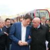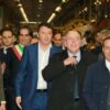 L’applauso degli operai dell’AnsaldoBreda di Reggio Calabria, la principale società italiana di costruzioni di rotabili per il trasporto su ferro, ha salutato la partenza del premier Matteo Renzi a conclusione della sua visita nello stabilimento reggino.