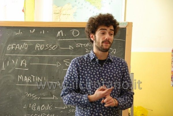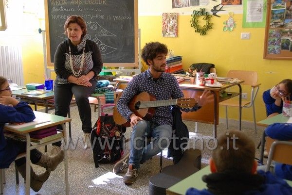 Pasquale Sculco alla scuola 'Ferrari' di Cirò Marina (25)Per rendere più significativa e completa l’esperienza, Pasquale ha tenuto una piccola lezione di musica, scrivendo alla lavagna grandi nomi della musica italiana come Celentano, Battisti, Dalla, Paoli, De Andrè, Mina, Rino Gaetano, Mia Martini e tanti altri, affiancati da una canzone di successo, e invitando i piccoli ad avvicinarsi alla musica “prendete uno strumento in mano: dal sax, alla batteria, al pianoforte, alla chitarra e investite nelle vostre passioni fin da piccoli, altrimenti queste passioni rimangono chiuse nei cassetti. Scoprite la musica, le canzoni, i testi ed emozionatevi”. Tra tante risate e applausi i bimbi hanno vissuto con estremo interesse ed entusiasmo l’incontro con il cantautore, che ha risposto a centinaia di domande e curiosità. Purtroppo la band, con l’inedito “Isole” (ascolta), non ha superato le audizioni per il prossimo Sanremo ma come ci dice Pasquale: “Il palco dell’Ariston per me è un sogno, quest’anno siamo andati vicinissimi però non sempre al primo colpo va bene. Comunque ritorno a studiare ed impegnarmi per raggiungere questo obiettivo”. Il 20enne cirotano ha poi cantato alcuni suoi brani “Questi uomini”, “Splende” e “Non saremo mai persi” brano dedicato alla sua (ex) ragazza. “Noi abbiamo una responsabilità sulle persone che ascoltano le nostre canzoni – ha spiegato Pasquale – quello che scriviamo deve trasmettere un messaggio positivo e oggi, purtroppo, ci sono tanti messaggi sbagliati”.