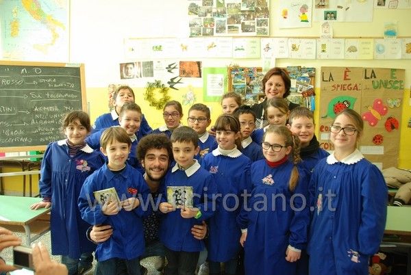 Pasquale Sculco alla scuola 'Ferrari' di Cirò Marina (47)Nella mattinata di sabato 13 dicembre il frontman della band dei Carboidrati, Pasquale Sculco, ha fatto visita alla scuola elementare “Ferrari” di Cirò Marina. Nell’ambito dell’iniziativa intitolata “Incontro con l’autore” Pasquale ha incontrato i bambini della classe terza intrattenendosi a lungo con loro chiacchierando, scherzando e cantando. La maestra Anna Foresi ha accompagnato i bambini in questo lungo viaggio nel mondo della musica affermando “Un musicista scrive le canzoni come un poeta scrive le poesie” riallacciandosi all’ultimo incontro con la poetessa Giusy Nisticò (leggi). Inutile dire che tutti gli alunni conoscevano il cantante, grazie all’esperienza vissuta nella trasmissione “Amici” di Maria De Filippi, e molti sapevano i testi delle canzoni a memoria.