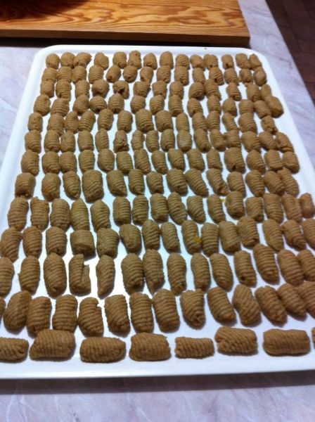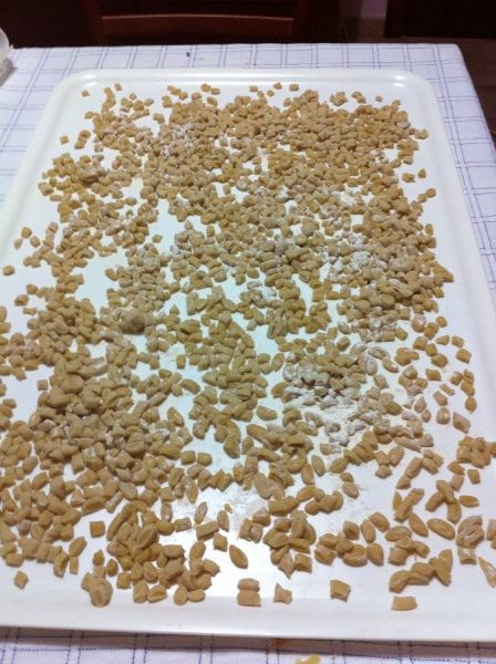 Mescolare gli ingredienti tutti insieme fino ad ottenere un impasto liscio, omogeneo e liscio. Disporre l’impasto su una spianatoia di legno e ricavare dei rotolini abbastanza lunghi di forma cilindrica da cui, con un coltello, tagliare dei tocchetti di circa 5 cm. Per dare ai crustoli quella forma particolare che ben conosciamo, passare su ognuno i rebbi di una forchetta con un movimento leggermente rotatorio perchè non devono risultare schiacciati. Lasciare riposare per un po’ tutti i tocchetti. Metterli a friggere per pochissimi minuti nell’olio bollente. Scolarli per bene. Riempire un pentolino di miele, farlo riscaldare per scioglierlo e tuffarvi un po’ alla volta i crustoli facendo aderire bene il miele ad ognuno di loro. Disporli su un capiente vassoio e poi deliziarsi a piacere.