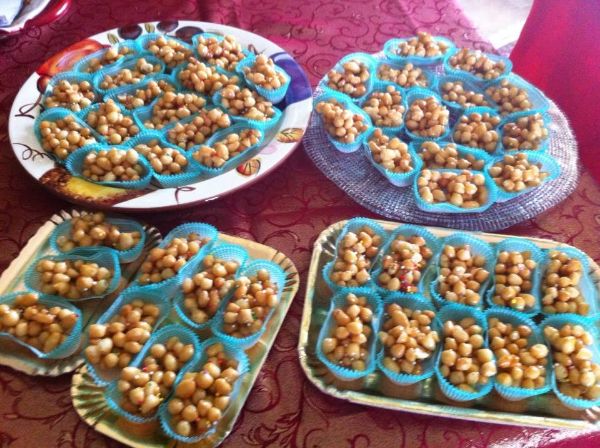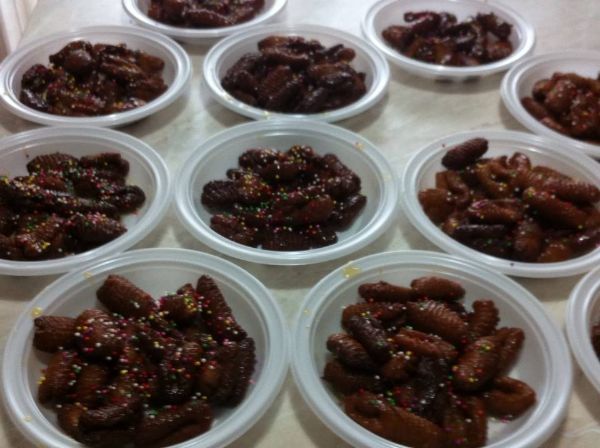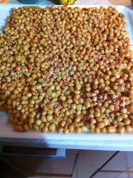 Impastare tutti gli ingredienti per 7 minuti e lasciare riposare per due ore. Sulla spianatoia disporre l’impasto e farne tanti rotolini sottili. Da ogni rotolino tagliare dei tocchettini piccolini e friggerli nell’olio bollente. Devono rimanere di colore chiaro.Dopo aver fritto e scolato tutti i tocchettini passarli in una pentola di miele caldo. Impregnare bene tutte le palline con il miele e versare su una spianatoia appiattendoli leggermente con un cucchiaio di legno. La nostra tradizione prevede di ricoprirli di confettini colorati e ritagliarli, una volta solidificati, a quadrotti servendoli su foglie di arancio.