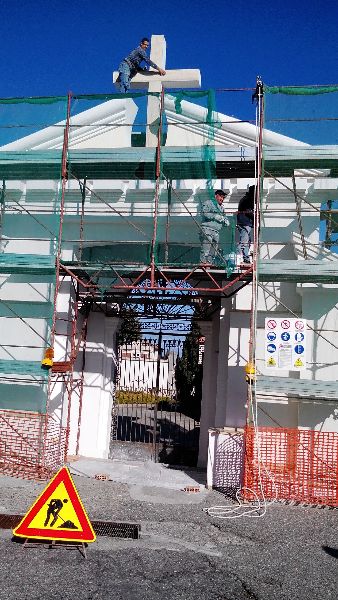 L’ingresso  del  cimitero è interessato da lavori di ripristino , è quanto si può osservare in questi giorni dove operai della ditta Morelli-Lettieri stanno ripristinando l’ingresso del Cimitero, lavori che si estenderanno anche alla adiacente casa mortuaria che presenta evidenti lesioni alle pareti laterali. Lavori importanti questi appena iniziati ma insufficienti se si considera che i lavori dovrebbero interessare anche il cimitero vecchio dove la parete che ospita il cimitero vecchio si sta sgretolando, quando piove le tombe dei piani superiori, rischiano di cadere come è successo qualche anno fa, quando dopo un forte temporale alcune tombe si erano sgretolate lasciando trasparire il loro contenuto.L’intera area, specie la parete dei loculi esterna, proprio all’ingresso del cimitero, forse la prima ad essere usata come loculi cimiteriali sin dai primi del 900 come riportato dalle date dei loculi adiacenti, è soggetta a smottamenti ed umidità, che col tempo hanno provocato lesioni a molti loculi dell’area ingresso del cimitero.