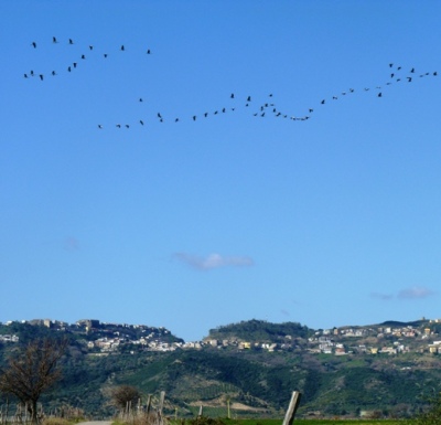 Evidentemente i cambiamenti climatici hanno inciso molto sull’orologio biologico degli uccelli migratori. Inoltre le Gru anticipano di un mese l’arrivo delle Cicogne, portatrici di natalità, anche se proprio domenica sono state già avvistate. L’evento è stato registrato dall’ornitologo Mario Pucci, che da anni appunto studia la migrazione degli uccelli nel crotonese, il quale ha detto:” Cirò resta una delle rotte migratorie più importanti del mediterraneo”. Proprio sullo stemma di Cirò c’è dipinta una Gru in vetta alle tre colline che protegge il popolo dall’invasore nemico, raffigurato da un serpente, afferrato tra gli artigli della fiera Gru. Dopo tutto nella tradizione popolare la gru è simbolo di buona fortuna e di buona salute. Ma fino a quanto ancora possiamo vedere il passaggio di questi meravigliosi uccelli, se le nostre campagne stanno cambiando diventando inospitali ed avverse , modificando per sempre l’habitat e la biodiversità che ci circonda, forse dovremmo considerare l’area di Frandina località protetta per consentire che ogni anno questi meravigliosi uccelli possano fermarsi prima di riprendere il loro lungo cammino.