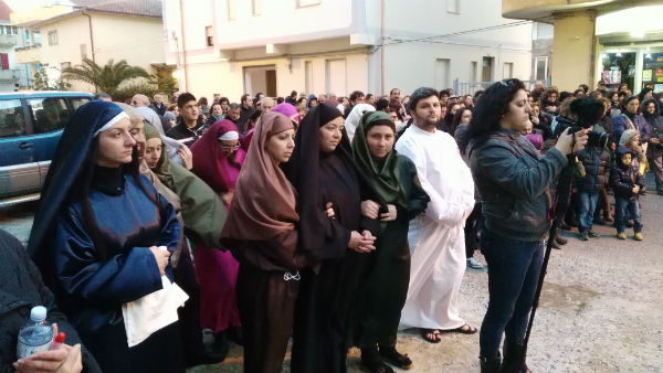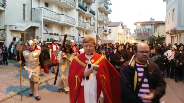 IMG_20150403_192910Un lungo corteo, nonostante la serata fredda e ventilata, ha seguito con grande e rispettosa attenzione le scene successive rappresentate lungo il percorso precedentemente stabilito e con le varie Stazioni allestite dagli abitanti nei rioni indicati dal G.P.W.: nelle adiacenze della Chiesa di San Francesco, passando per Corso Garibaldi fino a raggiungere Piazza Matteotti, dove Gesù incontra la madre Maria (Concetta Guarascio); in Via Marina la Va Stazione, allorché Simone il Cireneo (Michele Arena) aiuta il Cristo a portare la croce, e poco dopo sul Lungomare Kennedy (VIa Stazione) la Veronica (Rossella Lama) gli si avvicina per asciugargli la fronte. In via Pietro Nenni (VIIa Stazione) Gesù cade per la seconda volta e subisce ancora frustate per mano dei Centurioni (Roberto Aiello e Domenico Forciniti), poi in Via Amendola (VIIIa) incontra le Pie Donne (Francesca Gabriele, Francesca Cardamone, Angela Tridico, Maria Pia Grillo, Giusy Aiello, Raffaella Bevilacqua ed Elvira Labonia). La lunga processione al seguito dei figuranti raggiunge via Sybaris (Xa Stazione), attraversando il sottopasso Pianagrande, per rientrare nella Parrocchia Madre della Chiesa, nel cui giardino, avverrà la crocifissione ed i momenti finali della Via Crucis, nei quali troviamo anche i due ladroni (coi volti di Giuseppe De Marco e Giovanni D’Afflitto), Maria di Magdala (Raffaella Anania), Maria di Cleofa (Sabina Lucania) e Giuseppe di Arimatea (Daniele Cerminara). Gesù muore sulla croce, in un silenzio commovente, per poi essere deposto e portato nel sepolcro. Sono da poco trascorse le 21,00 e si ripete anche l’applauso finale per gli organizzatori del G.P.W. (Enzo Serafini, Saverio Berardi, Lina Buetto, Alfonso Artese, Vincenzo Pirillo, Nicola De Roberto e Antonella Nigro), oltre che ovviamente per gli oltre 40 protagonisti.