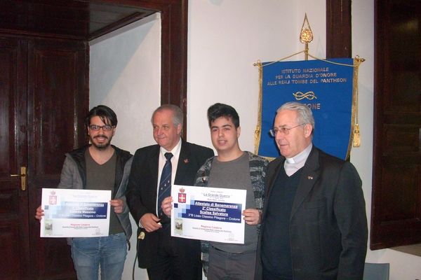 mostra fotografica sulla Grande Guerra a Crotone (1)A sala gremita e partecipativa ha aperto il dibattito il delegato Vincenzo Costa, dopo avere omaggiato assieme ai presenti l’Inno di Mameli spiegando ai presenti il motivo della mostra ed il motivo per cui sono nate le Guardie D’Onore. Ha fatto seguito una benedizione della giornata e del labaro da parte dell’assistente spirituale Don Franco Sinopoli ed un lettura della preghiera delle Guardie d’Onore da parte di Francesca Grosso. Dopodiché si è ritenuto convalidare le premiazioni in programma sulle tesine della Grande Guerra elaborate dagli studenti della 3° B del Liceo Classico Pitagora di Crotone, ed esaminate dalla Commissione delle Guardie D’Onore la quale all’unanimità ha deciso di premiare: Cafarda Massimo (Primo classificato) e Scalise Salvatore (Secondo classificato). Altri encomi di Benemerenza sono stati consegnati a Mariantonietta Ilaria Viscomi, alla Prof. Angela Manica, a Don Franco Sinopoli, alla D.ssa Ornella Campana, al delegato della Capitaneria di Porto di Crotone. Un rinfresco ha concluso l’evento, la mostra sarà aperta al pubblico fino a giorno 17 Aprile 2015