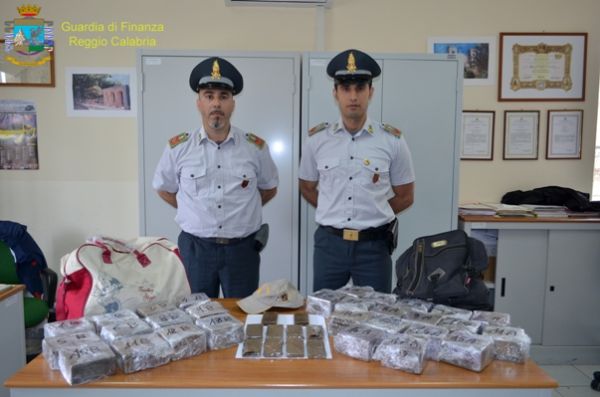 I Finanzieri di Reggio Calabria hanno sequestrato 30 Kg di “hashish” e tratto in arresto, su disposizione della Procura della Repubblica di Reggio Calabria, due soggetti, D.G. di anni 33 e D.R. di anni 26, entrambi di Palermo. In particolare, i militari della Tenenza di Villa San Giovanni, unitamente ai colleghi specializzati del servizio cinofili di Reggio Calabria, hanno ispezionato accuratamente i passeggeri ed il vano bagagli di un bus di linea proveniente da Roma e diretto in Sicilia.