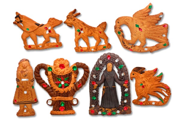 I grandi festeggiati secolari sono i mostaccioli di Soriano Calabro, detti “mastazzola”, in origine prodotti anche con mosto cotto, da cui prendono il nome (mustaceum, mustacea, antica focaccia preparata con farina, mosto cotto e anice, condita con grasso cacio e cotta su foglie di lauro), sono dei gustosi biscotti prodotti oggi esclusivamente con farina, miele e tanti aromatici ingredienti, secondo una ricetta che, da secoli, i Sorianesi si tramandano da padre in figlio. Il filologo G. Rohlfs, nel suo “Dizionario dialettale delle tre Calabrie”, definisce i “mostaccioli sorianesi” “specie di dolci di farina impastata con miele o mosto cotto”; mentre, per lo scrittore G.B. Marzano, sono “dolci caserecci fatti con farina, miele cotto, conditi con droghe, di forma romboidale, a pupattoli, panierini e simili.”(Dizionario etimologico del dialetto calabrese). Anche se Soriano è considerata la vera patria di questi tipici dolci calabresi, che da febbraio a settembre sono presenti in tutte le sagre e le feste, per la verità non è l’unico paese produttore. Ma i nostri si distinguono dal tipo di lavorazione, come spesso mi raccontava mio padre sorianese. Qui ogni singolo “pezzo” è lavorato a mano su lunghe tavole di noce, sulle quali i giovani lavoranti, dopo aver manipolato a dovere la farina, il miele e le essenze aromatiche, modellano, con la pasta ottenuta, gli oggetti più strani e bizzarri. Nascono così, oggi un po’ di meno per via della modernità e della sovrabbondanza di altri dolci provenienti dal nord, nascono così, dicevo, cavallucci, agnellini lanuti, torelli bizzosi, grandi cuori con la scritta “ti amo” o “amor” e tanti altri “scherzi” (come in gergo vengono chiamate queste composizioni), in cui elementi decorativi ed un ricercato gusto del particolare, danno vita ad antiche forme, cristallizzate dalla tradizione.