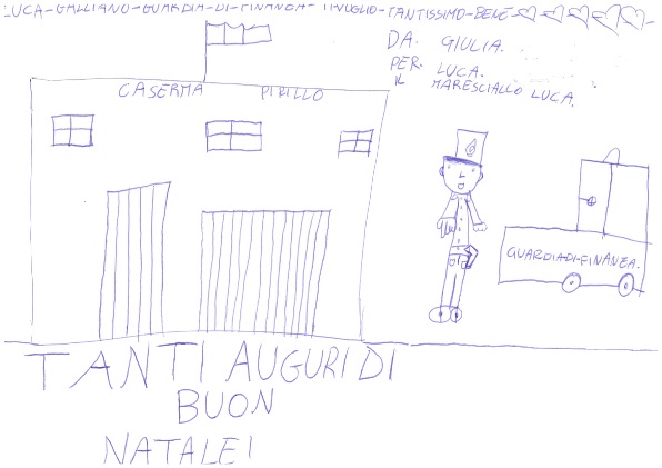 Con la stessa genuinità giovanile, la bambina, al termine, ha regalato ai due ispettori delle Fiamme Gialle un disegno, quale augurio di “buon Natale”, dove, teneramente, ha ritratto la caserma, un’auto della Guardia di Finanza e un Finanziere in divisa. Il gesto, per quanto semplice, si commenta da se’, per il clima di rispetto reciproco: ciò ha “toccato“ gli operanti e la gerarchia superiore che, a testimonianza di ciò, ha convocato in seguito la famiglia presso la caserma, ove ha consegnato piccoli doni e gadget alla bimba, accomiatandosi con un semplice ma ricco di significato, saluto ai genitori della piccola “Finanziera in erba di Crotone“, che hanno ringraziato il Corpo per la sensibilità dimostrata. Il tutto a dimostrazione come la missione istituzionale di tutela della legalità economica affidata alla Guardia di Finanza, sia portata avanti non solo mediante l’applicazione della legge ma anche attraverso il rispetto, l’attenzione e l’educazione verso i cittadini, adempiendo pienamente i propri doveri con i dovuti garbo e professionalità.