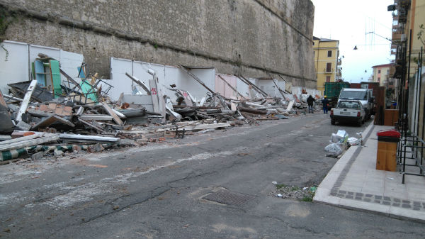 Dalla decisione alla demolizione d’abbattere i locali commerciali costruiti a ridosso del Bastione in Via Tellini ci sono voluti oltre dieci anni ma alla fine le ruspe li hanno demolite in data 19 gennaio 2016. Via Tellini, zona commerciale nata subito dopo la guerra con box d’occasione, denominata zona delle bancarelle, era divenuta negli anni successivi l’Outlet delle famiglie meno abbienti e non solo di Crotone. La vicinanza dell’attività commerciale nel pieno centro cittadino dava la possibilità anche a chi arrivava da fuori Crotone di fare acquisti a basso costo. La loro storia