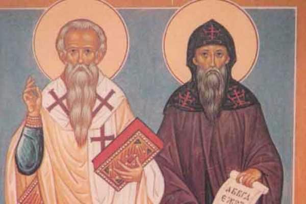 I fratelli Cirillo, al secolo Costantino, (827 – 869) professore di filosofia alla scuola imperiale, e Metodio, (815 – 885), dedicatosi molto giovane alla vita monastica sul monte Olimpo in Asia Minore, nativi di Tessalonica e figli di Leone, dignitario imperiale, il drungarios (vicegovernatore), sono da sempre venerati come apostoli degli Slavi. Nel 1980 sono stati proclamati da Giovanni Paolo II, slavo tra i latini e latino tra gli slavi, con la Lettera Apostolica Egregiae virtutis compatroni d’Europa assieme a san Benedetto da Norcia, nel contesto di una forte sottolineatura della necessità di ritrovare e testimoniare l’unità spirituale dell’Europa cristiana, come scrive Giovanna Parravicini. Inviato con il fratello in missione diplomatica presso i Chazari e poi in Moravia, Cirillo compose il nuovo alfabeto che da lui prese il nome e tradusse con il fratello la Sacra Scrittura. Scrive ancora Giovanni Paolo II nella Enciclica Slavorum apostoli che “Cirillo e Metodio sono come gli anelli di congiunzione, o come un ponte spirituale tra la tradizione occidentale e quella orientale, che confluiscono entrambe nell’unica grande tradizione della Chiesa universale. Essi sono per noi i campioni e insieme i patroni nello sforzo ecumenico delle Chiese sorelle d’Oriente e d’Occidente, per ritrovare mediante il dialogo e la preghiera l’unità visibile nella comunione perfetta e totale”. E non solo. Anche il successore al soglio pontificio Benedetto XVI, nell’udienza generale del 17 giugno 2009, così sottolineava: “In effetti, Cirillo e Metodio costituiscono un esempio classico di ciò che oggi si indica col termine ‘inculturazione’: ogni popolo deve calare nella propria cultura il messaggio rivelato ed esprimerne la verità salvifica con il linguaggio che gli è proprio”. Scrive ancora la Parravicini che “la proclamazione di Cirillo e Metodio compatroni d’Europa, affermando una più vasta unità del continente e dilatandone i confini fino ad includervi le popolazioni delle regioni orientali, ha ratificato anche, quale elemento costitutivo dell’identità europea, la presenza al suo interno di una duplicità di matrici e di eredità culturali, di cui Benedetto, ‘patriarca d’Occidente’, e i due fratelli tessalonicesi costituiscono gli emblemi viventi”.