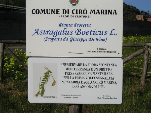 Nessun rispetto per la biodiversità, nessun rispetto per un’area protetta dove cresce una rara pianta all’entrata di Cirò Marina, proprio al bivio per Cirò, nemmeno i visibili cartelli posti attorno alla recinzione hanno fermato i lavori che hanno devastato l’area in questione. Ma chi mai avrà dato le necessarie autorizzazioni per scavare all’interno di questa area protetta, si spera almeno che gli enti preposti al controllo facciano le loro indagini per stabilire eventuali responsabilità. Attorno al sito dove cresce la pianta: l’Astragalus boeticus L. Astragalus boeticus L. jpg, esiste una recinzione sul lato opposto della rotatoria, sottostante la statale 106, era stata eretta a protezione della pianta che è segnalata per la prima volta nel cirotano nel 2003 all’UniCal sulla rivista “Società Botanica Italiana”, da un botanico locale. Il parapetto in legno, delimitando lo spazio accessibile, doveva evitare incidentali o involontari danneggiamenti della pianta originaria del nord africa e diffusa in diverse aree del meridione. L’amministrazione comunale dell’epoca aveva fatto apporre anche un cartello informativo che invitava al rispetto della natura.