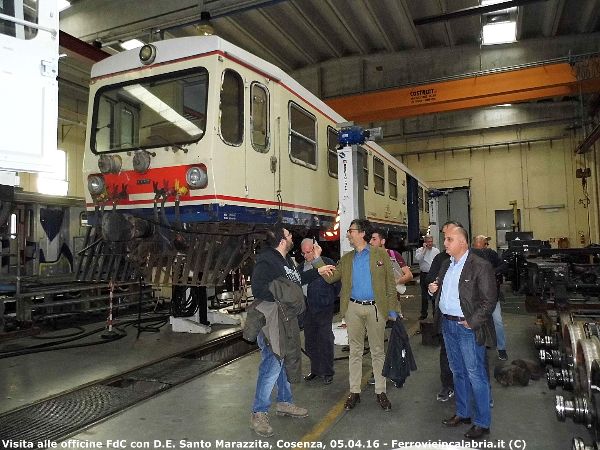 Alle 15.42, dopo aver goduto delle bellezze paesaggistiche della Rogliano – Cosenza, (sulla quale già oggi organizziamo i treni speciali a vapore Brutia Express) e di quel poco di Ferrovia Silana ammirabile alla stazione di diramazione di Pedace, il treno 164 ci saluta alla stazione di Cosenza Vaglio Lise…dove, in rappresentanza delle Ferrovie della Calabria, ad attenderci c’erano il Direttore d’Esercizio Santo Marazzita ed il Responsabile Servizi Amministrativi Ferroviari, Antonio Iannicelli. Assieme a loro, ci siamo spostati nelle vicine officine ferroviarie, all’interno delle quali abbiamo ammirato i rotabili in corso di manutenzione, oltre alla mitica, gloriosa ed ormai famosissima vaporiera FCL 353. Il Direttore d’Esercizio, Ing. Marazzita, ha anche illustrato le tante lavorazioni che vengono eseguite all’interno della struttura, tecnologicamente all’avanguardia, e dotata di maestranze capaci di autocostruire al tornio (cosa non scontata al giorno d’oggi) componenti meccaniche sia per la vaporiera che per il materiale rotabile in servizio ordinario, dalle storiche automotrici Breda M2.200, ai nuovissimi complessi Stadler DE M4c.