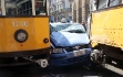 Auto polizia tenta sorpasso ma rimane incastrata tra due tram: FOTO