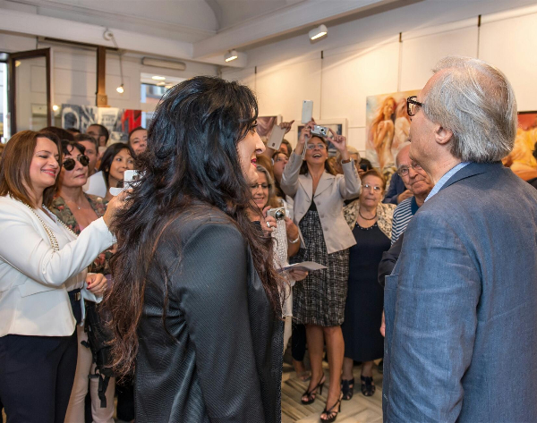 di sole donne semplicemente perché è il mio mondo. Da donna posso esternare ciò che si cela dietro uno sguardo, una movenza. Dicono che abbia una visione quasi maschile nel dipingere la sessualità femminile ma in realtà è solo un riflesso. La collocazione della figura femminile in un flusso, in un élan vital che non è più solo di segno maschile, senz’altro è un po’ la ragione dominante della mia pittura. Il prevaricante antropomorfismo è cessato e la donna è ora modernità, energia, pensiero. Senza dimenticare che è sempre stata ispirazione, poesia, tradizione e mitologia”. Mistral nasce in Calabria, a Cirò Marina e afferma ancora: “ “ La mia vita in Calabria, la mentalità calabrese, l’educazione familiare, la formazione culturale in Accademia costituiscono il background dal quale non è facile, e nemmeno poi io lo vorrei, liberarsi. Costituisce invece il canovaccio, lo scheletro, l’architrave su cui costruire il nuovo, cui poter esprimere per così dire il sogno, l’aspirazione estetica”. Per questi motivi vedendo i quadri di Mistral, come è stato sottolineato dai tanti estimatori e curiosi intervenuti, si può sentire l’eco del racconto “Quando fu il giorno della Calabria” di Leonida Repaci: “Dio si trovò in pugno 15000 kmq di argilla verde con riflessi viola. Pensò che con quella creta si potesse modellare un capolavoro. Si mise all’opera, e la Calabria uscì dalle sue mani…..Diede a Cirò il vino ..(e ora anche Mistral)…Volle le persone fiere, leali, socievoli e ospitali. Volle il mare sempre viola, la rosa sbocciante a dicembre, il cielo terso, le campagne fertili, le messi pingui, l’acqua abbondante, il clima mite, il profumo delle erbe inebriante. Il Diavolo però aggiunse le calamità, le necessità e i bisogni della giustizia, della libertà, della grandezza, del nuovo, del meglio. La felicità della Calabria sarà raggiunta con più sudore. Utta a fa juornu c’a notti è fatta -. Una notte che già contiene l’albore del giorno”. In alcuni quadri notturni “Decursus”, “Percorsi” “Persecution”, Francesca dimostra di metterci la sua anima femminile e mediterranea. Si può pensare che in essi abbia in mente le lunghe notti “aspettando un bus notturno a piazza Venezia, un tram o guidando con la mitica cinquecento sui sampietrini del centro storico di Roma, cantando una canzone dell’amato cantautore calabrese Rino Gaetano. (La recensione è stata affidata a Maria Rosaria Lopez). Durante l’esposizione Mistral ha regalato a Sgarbi un ritratto che la ritrae insieme anche al marito, Pierluca.