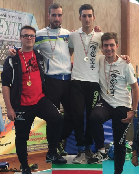Accademia Karate Crotone porta a casa due Ori ed un Argento conquistati alla Fase Regionale di Qualificazione del Campionato Italiano a Squadre Giovanile( 14/17 anni) e Campionato Italiano a Squadre Assolute (18/35 anni) organizzati dalla delegazione provinciale settore Karate Fijlkam di Catanzaro diretta dal M° Vincenzo Ruberto. Come accade ormai da anni ancora una volta la formazione dei “Falchi” dell’ASD Accademia Karate Crotone ha portato a casa l’ORO e l’ennesimo Titolo Assoluto maschile nel KUMITE (combattimento) e la relativa qualificazione nazionale grazie ad Angelo Arditi ,oggi anche nelle vesti di “capitano” e Andrea Marchio, Emanuele Pascuzzi e Pasquale Cimino. A questo bel risultato ha fatto seguito anche la qualificazione nazionale della squadra femminile Assoluta di KATA( esercizio sincronizzato) formata da Alessandra Lo Iacono, Isabella Facciolo e Serena Galea le quali sono salite sul secondo gradino del podio aggiudicandosi la medaglia d’ARGENTO. A completare la giornata positiva per il M° Rosario Stefanizzi, Responsabile del settore Agonistico dell’AKC, è giunta anche la terza qualificazione per l’AKC grazie alla squadra giovanile femminile di KATA formata da Ylenia Pipita, Cristiana Crugliano ed Emilia Manica che si sono di nuovo aggiudicate l’ORO ed il Titolo già in loro possesso dallo scorso anno sottolineando il lavoro positivo svolto dal M° Luigi Galea. La manifestazione, diretta dagli ufficiali di gara guidati da Giuseppe Notarianni e Vincenzo Martino, è stata arricchita anche dalla qualificazione degli Esordienti A(12/13 anni) ed ha visto la partecipazione di un folto pubblico venuto ad incitare i propri beniamini. La presenza del presidente regionale Fijlkam Gerardo Gemelli e del Vice presidente di settore Francesca Bilardi ha dato ufficialità alla manifestazione ed officiato alle premiazioni coadiuvati da Enzo Migliarese(Responsabile del Centro Tecnico Regionale Calabria) Luciano Dichiera (Responsabile Settore Diversamente Abili Fijlkam Calabria ) e Viola Zangara (Referente Regionale Calabria Fijlkam), che hanno chiuso la manifestazione.
