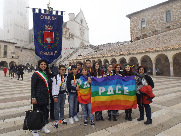 ecipazione del Comune di Diamante alla Marcia della Pace insieme a una rappresentanza di alunni e docenti della Scuola Secondaria di I Grado dell’Istituto Comprensivo cittadino è stata un’esperienza emozionante e straordinariamente coinvolgente , lo dichiara il Vicesindaco, Francesca Anna Casella, all’indomani della XXI Marcia Perugia – Assisi in cui anche il gonfalone della Città di Diamante, ha sfilato fino alla Rocca di Assisi in testa al corteo che ha visto, secondo gli organizzatori, la partecipazione di oltre centomila persone. I ragazzi hanno vissuto, con entusiasmo, la giornata intensa e particolarmente significativa trascorsa ad Assisi. Abbiamo voluto portare una testimonianza di Pace aderendo pienamente a quello che era il tema della Marcia di quest’anno: la necessità di vincere l’indifferenza nei confronti dei tanti conflitti purtroppo presenti nel Mondo e delle violazioni dei Diritti Umani, del razzismo e di fenomeni aberranti come il femminicidio. Si tratta di argomenti – prosegue il Vicesindaco – sui quali devono essere necessariamente coinvolte la scuole proprio perché determinanti per la crescita delle nuove generazioni. Per questo era fondamentale la presenza di una delegazione di nostri studenti, per la cui partecipazione devo nuovamente ringraziare il Dirigente Scolastico dell’Istituto Comprensivo di Diamante, Leopoldo Di Pasqua. Un grazie va anche alle insegnanti Flavia Benvenuto e Emilia Amoroso, che hanno accompagnato i ragazzi in questo viaggio. Un ringraziamento va rivolto all’Agente di Polizia Municipale Salvatore Merlino che ha fatto parte della delegazione e retto il gonfalone di Diamante. Un viaggio che lascia in tutti noi un segno profondo contribuendo non solo, come auspicato dal Santo Padre, a rendere “ancora più viva la consapevolezza che la guerra distrugge sempre e con essa si perde tutto” ma anche a rafforzare il nostro impegno quotidiano di cittadini concretamente attenti ai temi della pace, della tolleranza e dei diritti umani