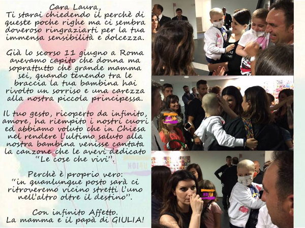 osì inizia la lettera per Laura Pausini, che i genitori di Giulia, Nicodemo e Stefania, hanno scritto per far si che Laura possa leggerla.v