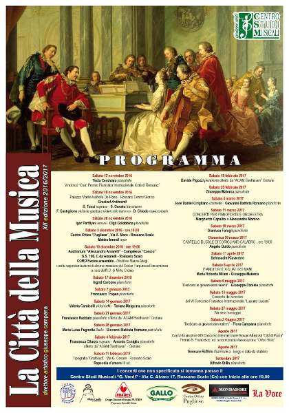 Cultura, arte e musica per una stagione concertistica di altissimo livello- commenta il Direttore M° Pino CAMPANA – in cui i musicisti eseguiranno programmi attinenti al repertorio musicale dal Barocco ai primi del 900. Una grande kermesse che nasce con la volontà iniziale di promuovere i vincitori dei concorsi più importanti della provincia. Si esibiranno infatti la vincitrice del “Gran Premio Pianistico Internazionale Città di Rossano”, tre concerti offerti dall’ACAM Beethoven, il vincitore del concorso internazionale “Vincenzo Scaramuzza”, il vincitore del concorso “Luciano Luciani”, ed uno dei vincitori del “Concorso Internazionale per Giovani Musicisti Città di Paola”. Inoltre la kermesse ospiterà musicisti da tutto il mondo, tra cui dei Russi.