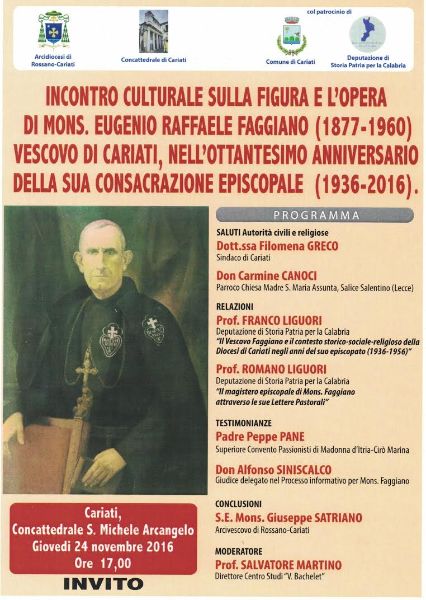 Su iniziativa degli storici Franco e Romano Liguori, in collaborazione con l’Arcidiocesi di Rossano-Cariati e col patrocinio del Comune e della Deputazione di Storia Patria per la Calabria, si terrà  GIOVEDI 24 NOVEMBRE 2016 (ore 17,00), nella Cattedrale S. Michele Arcangelo, un’ interessante iniziativa finalizzata a far memoria di un uomo di chiesa, che ha avuto un ruolo da protagonista nella storia di Cariati della prima metà del Novecento. Ad illustrare la figura e l’opera di questo indimenticabile vescovo saranno gli stessi Franco e Romano Liguori, impegnati da moltissimi anni a ricostruire storicamente fatti e figure della storia civile ed ecclesiastica della nostra Città, autori di un recente saggio sul Vescovo Faggiano, pubblicato nel 2015 nel volume “La Calabria dall’Unità al secondo dopoguerra” di autori vari, a cura di Pantaleone Sergi, edito dalla Deputazione di Storia Patria per la Calabria. Sarà presente alla manifestazione e interverrà, per le conclusioni, l’arcivescovo dell’Arcidiocesi di Rossano-Cariati, Mons. Giuseppe Satriano. Interverranno anche i sacerdoti D.Alfonso Siniscalco (Strongoli), D. Carmine Canoci (Salice Salentino), il passionista P. Peppe Pane (Chiesa di Madonna d’Itria, Cirò M.). Partecipa all’iniziativa, col suo patrocinio, l’Amministrazione Comunale, rappresentata dal sindaco dott.ssa Filomena Greco, che porterà un saluto agli organizzatori e ai relatori.