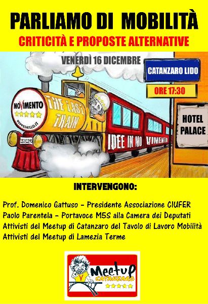 La nota del meetup continua: «Valuteremo proposte partendo da un’attenta analisi delle criticità del sistema di mobilità attuale e insieme al nostro portavoce alla Camera dei Deputati Paolo Parentela, autore di diversi atti parlamentari in merito ai trasporti in Calabria, approfondiremo i progetti relativi al nuovo collegamento ferroviario metropolitano cittadino, la tratta ferroviaria Catanzaro-Lamezia Terme e la tratta Catanzaro-Cosenza. Ovviamente le proposte avranno come stella cometa la mobilità sostenibile, per aiutare i cittadini della provincia di Catanzaro ad avere un sistema di trasporti maggiormente alla portata di tutti».