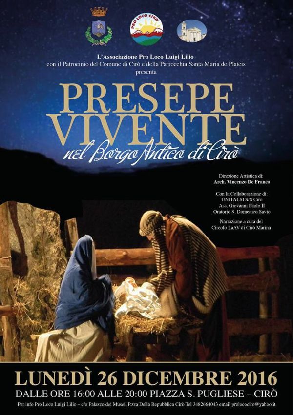 PRESEPE VIVENTE NEL BORGO ANTICO. LUNEDÌ 26 DICEMBRE, giorno di Santo Stefano. – ciro-presepevivente-261216Promosso dalla Pro Loco Luigi LILIO Cirò, patrocinato dall’Amministrazione Comunale e dalla Parrocchia Santa Maria de Plateis, in collaborazione con le Associazioni Unitalsi, Giovanni Paolo II e Oratorio San Domenico Savio, la rappresentazione si terrà dalle ORE 16 alle ORE 20, lungo il percorso che da Porta Mavilia porta a Piazza Pugliese.