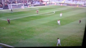 Il risultato di parità dura soltanto sette minuti. Al sessantaquattresimo Ferrari commette un fallo su Simeone in area di rigore e l’arbitro concede la massima punizione (primo rigore stagionale a favore del Genoa).