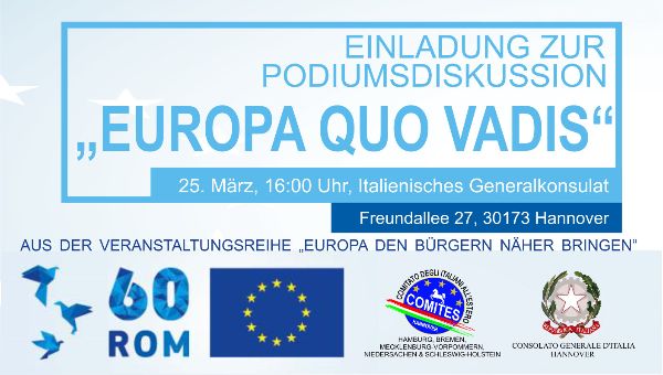 Sotto il motto: “EUROPA QUO VADIS“, il Comites di Hannover, in collaborazione con il Consolato Generale di Hannover, ha organizzato una tavola rotonda a cui prenderanno parte il parlamentare del Parlamento Europeo Bernd Lange ( SPD ) e Regina Asendorf, portavoce del partito Bündnis 90/Die Grünen Bassa sassonia per gli affari Europei. Moderazione di Claudio Provenzano.La manifestazione si terrà il sabato 25. Marzo, alle ore 16,00 presso il Consolato Generale di Hannover.