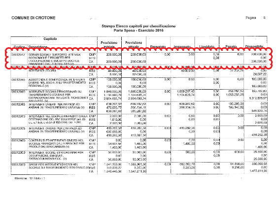 L’elevata percentuale di disoccupati unitamente alle difficoltà di migliaia di famiglie crotonesi in stato di grave difficoltà economica imporrebbero infatti una seria proposta di misure a sostegno del reddito. Si è evidenziato come, a differenza del comune di Pomezia, nei capitoli di bilancio del Comune di Crotone, la previsione e la disponibilità nel settore delle politiche sociali, con riferimento ai “soggetti a rischio di esclusione sociale”, è pari a 0,00 €, quando, invece, l’analisi del contesto sociale cittadino imporrebbe una seria proposta di misure di sostegno al reddito.