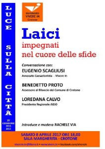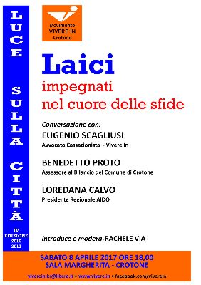 L’identità ed il ruolo dei laici nella nostra società sarà al centro del convegno organizzato dal Movimento Vivere In, che vedrà il contributo di Eugenio Scagliusi, avvocato cassazionista del Consiglio direttivo nazionale di Vivere In, Benedetto Proto Assessore al bilancio del Comune di Crotone e Loredana Calvo, presidente regionale dell’Aido e membro di Cittadinanzattiva. Introduce e modera i lavori Rachele Via, responsabile del Movimento Vivere In di Crotone.