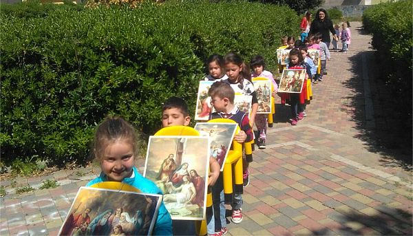 precedentemente allestista con dei quadri rappresentanti le quindici stazioni, di fronte ai quali i bambini hanno sostato e pregato. Nella prima stazione i bambini hanno appreso la condanna a morte di Gesù che, nonostante abbia trascorso la sua vita facendo miracoli e curando i malati, nessuno lo ha aiutato. Come Gesù, nella seconda stazione, accetta la sua croce anche i bambini hanno chiesto al nostro Signore di aiutarli a portare le loro piccole croci quotidiane, ad esempio essere ubbidienti con mamma e papà e non prendere in giro gli altri. Nella terza stazione è stato spiegato che sotto il peso della croce Gesù è caduto, deriso e maltrattato dai soldati. Nonostante ciò Gesù si è rialzato e da questo esempio i piccoli hanno capito che bisogna essere costanti nelle cose buone e portarle al termine al meglio delle proprie possibilità. Gesù incontra la sua mamma, nella quarta stazione, e proprio in questa occasione i bambini hanno pregato per tutte le mamme del mondo, ringraziando Dio di questo dono meraviglioso. Nella quinta stazione è raffiguarto Simone il cireneo che aiuta Gesù a portare la croce. Ciò fa capire ai piccoli che ogni gesto d’aiuto non verrà dimenticato, perchè è un segno d’amore e come tale rimane per sempre. Proseguendo nella processione i bambini