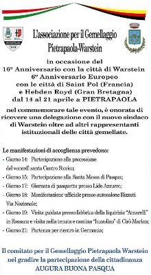 16 anniversario gemellaggio Pietrapaola-WarsteinL’associazione per il Gemellaggio Pietrapaola-Warsteinin occasione del 16° anniversario del gemellaggio con la città di Warstein ed il 6° anniversario del gemellaggio  europeo con le città di Saint Paul (Francia) e HebdenRoyd (Gran Bretagna) ha inteso organizzare una serie di incontri e di eventi, dal 14 al 21 Aprile a Pietrapaola, per accogliere una nutrita delegazione delle città gemellate,  accompagnate dal nuovo sindaco di Warstein e da altre autorità delle città gemellate.