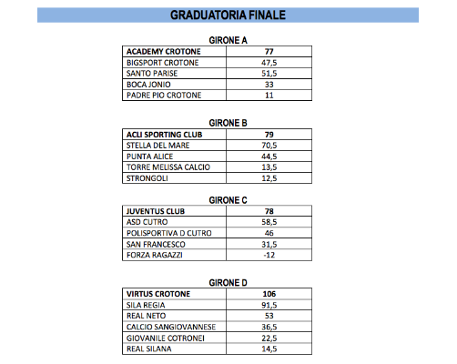 La Scuola Calcio “Asd Acli Sporting Club” di Cirò Marina, con il Presidente dr. Francesco Malena, il Mister Cataldo Blefari e lo Staff tecnico Enzo Aloisio, Francesco Lamberti, Carlo Alfieri e Domenico Cosentino. Vince con merito questo Girone. Ecco la graduatoria finale.