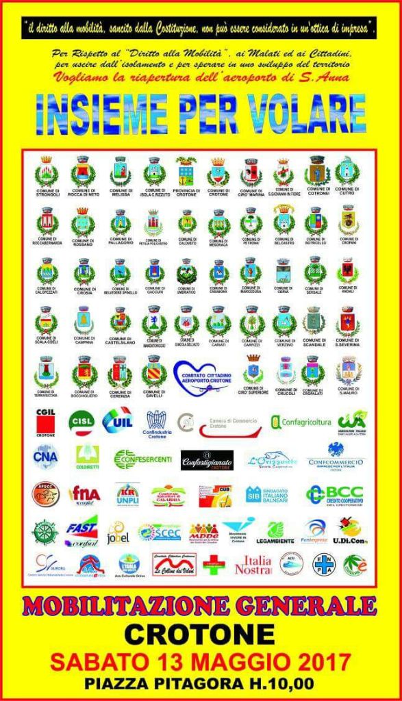 Il Comitato Cittadino Aeroporto Crotone, i Sindaci del Territorio, la Provincia di Crotone, i Sindacati CGIL CISL e UIL, la Camera di Commercio, Confcommercio, Confindustria, Confartigianato, Confagricoltura, CIA, CNA, Confesercenti, Coldiretti, U.Di.Con, fna confsal, BCC del Crotonese e molte rappresentanze associazionistiche, rendono noto a tutti gli organi di informazione che Lunedì 8 Maggio alle ore 10.00 presso La Sala Azzurra della Provincia si terrà La Conferenza Stampa per la Mobilitazione “Insieme per volare” prevista per Sabato 13 Maggio alle ore 10.00.