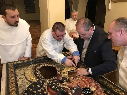 Ed ancora, l’ostensorio – reliquiario della Santa Spina di Petilia Policastro, un’opera che artisticamente rappresentasse la prova del fuoco cui fu sottoposta la Santa Spina a conclusione del processo della sua veridicità avvenuto il 20 ottobre 1573. E dal suo laboratorio le sue opere prendono continuamente il volo dappertutto e non solo in Italia e in diversi ambiti. Per la vicina chiesa dei santi Pietro e Paolo di Papanice ha realizzato una palma in argento per il simulacro di san Pantaleone e ancora per questa chiesa una raggiera in argento, oro e pietre. Successivamente ha realizzato la spada per san Michele Arcangelo di Cuturelle di Cropani,; la corona per santa Veneranda di Carfizzi; le corone della Madonna Regina Pacis della Cattedrale di Ostia, lo stellario per l’Immacolata di Castelsilano e le corone della Madonna della Pietra di Chiaravalle Centrale. E sarebbe ancora lungo l’elenco delle opere sacre realizzate dal nostro Affidato e sparse in ogni dove. Ma ormai Michele Affidato è destinato a diventare un orafo di livello europeo e forse anche di più. Nei mesi scorsi, infatti, un incarico importante e prestigioso gli è stato assegnato in Polonia, dove quest’anno, 2017, sarà celebrato il 3° centenario dell’incoronazione dei diademi papali sul miracoloso quadro della Madonna nera di Czestochowa, il santuario mariano polacco tanto amato da papa Giovanni Paolo II: Michele Affidato ha realizzato i nuovi diademi per la Madonna di Czestochowa, Regina della Polonia. Un’occasione che sarà vissuta non solo sotto il profilo artistico ma anche ecclesiale, come messaggio di unione tra i popoli accumunati nella fede in Gesù Cristo, il figlio di Maria. Infatti sarà l’occasione per suggellare un gemellaggio tra i santuari di Czestochowa,e Capocolonna. Il prossimo 18 maggio nella Basilica Cattedrale di Crotone, i Padri Paolini dell’Ordine di san Paolo primo eremita, Custodi dell’icona della Madonna nera polacca ritireranno i nuovi diademi che incoreranno il volto della Vergine di Czestochowa. dell’icona “Ho voluto, dice Affidato, in accordo con la Chiesa di Jasna Gora e quella crotonese, che questa creazione venisse consegnata a Crotone ai Padri Paolini e che proprio dalla mia città, cuore del Mediterraneo, terra di storia, arte e cultura ed in particolare modo del gemellaggio della Chiesa crotonese e di quella di Jasna Gora, partisse, per il tramite del mio lavoro, un messaggio di pace ed unione dei popoli, convocati dall’amore verso Maria, la Madre del Salvatore. In un tempo in cui le guerre sono sempre più frequenti ho un desiderio e una speranza che l’arte, la spiritualità, il desiderio di camminare insieme grazie al gemellaggio dei due santuari, possano alimentare un messaggio di pace e farci costruire un mondo nuovo e più giusto all’ombra delle due icone mariane ormai affiancate per sempre.”