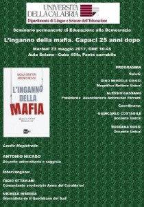 Ll’80° seminario del progetto scientifico-didattico di Pedagogia della R-Esistenza, si terrà domani, martedì 23 maggio, alle ore 10.45, presso l’aula Solano del Dipartimento di Lingue e Scienze dell’Educazione (cubo 19/B, ponte carrabile). Il Prof. Antonio Nicaso, tra i massimi esperti mondiali del fenomeno mafioso, parlerà di Capaci 25 anni dopo, partendo dal suo ultimo lavoro scientifico L’inganno della mafia, scritto a quattro mani con il Giudice Nicola Gratteri. Il seminario sarà coordinato dai docenti Unical Giancarlo Costabile e Rossana Rossi, e introdotto dai saluti istituzionali del Magnifico Rettore Gino Mirocle Crisci e dal Presidente dell’Associazione antiracket Lucio Ferrami di Cosenza, Alessio Cassano. Dopo la lectio magistralis del Prof. Nicaso, sono previsti gli interventi di Michele Inserra, giornalista de Il Quotidiano del Sud, e Fabio Ottaviani, Comandante Provinciale dell’Arma dei Carabinieri.