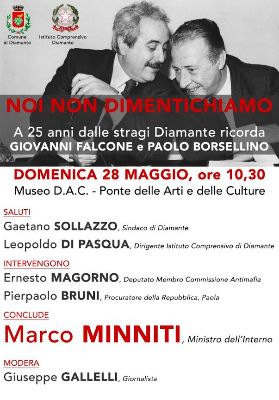 Con una manifestazione pubblica che vedrà la partecipazione del Ministro dell’Interno, Senatore Marco Minniti l’Amministrazione Comunale di Diamante ricorderà le figure di Giovanni Falcone e Paolo Borsellino a venticinque anni dalle terribili stragi di Capaci e di Via D’Amelio. L’iniziativa, che si svilupperà in collaborazione con l’Istituto Comprensivo di Diamante, si svolgerà domenica 28 maggio alle ore 10,30, presso il Museo Dac – Ponte delle Arti e delle Culture (Piazza A. Di Maio). Il programma prevede i saluti del Sindaco di Diamante, il Dott. Gaetano Sollazzo; del Dirigente Scolastico dell’Istituto Comprensivo, il Prof. Leopoldo Di Pasqua. Interverranno: il Deputato membro della Commissione Antimafia, On. Ernesto Magorno; il Procuratore Capo della Repubblica di Paola, dott. Pierpaolo Bruni. Moderatore sarà il giornalista Giuseppe Gallelli. Le conclusioni saranno affidate, come detto al Ministro dell’Interno, Senatore Marco Minniti, che al termine della manifestazione premierà i vincitori di un concorso che vedrà coinvolti gli alunni delle Medie dell’Istituto Comprensivo, invitati a presentare un breve testo ispirato al tema della giornata. L’Amministrazione Comunale di Diamante esprime profonda gratitudine al Ministro dell’Interno Minniti per aver assicurato la sua presenza a Diamante in occasione di un importante evento organizzato per ricordare Giovanni Falcone e Paolo Borsellino, due giganti della legalità di cui è necessario trasmettere, in particolare, alle giovani generazioni l’esempio e i valori positivi del loro straordinario impegno.