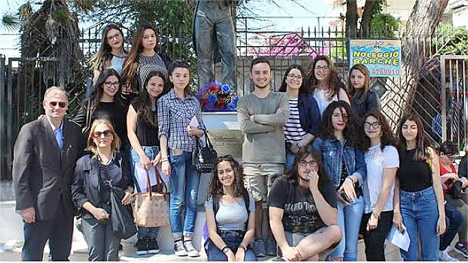 Questa mattina accompagnati dalla docente Antonella Martino hanno prima intonato la celebre “a mano a mano” diventata con “il cielo è sempre più blu” l’inno del Crotone Calcio e poi deposto ai piedi della statua di Rino Gaetano nell’omonima piazza che lo ricorda un fascio di fiori rossoblù.