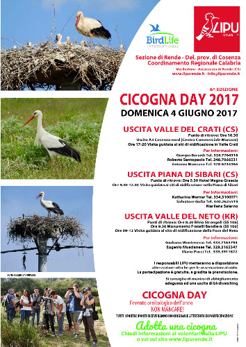 La Cicogna bianca è una specie che tutti conoscono ma che pochi ancora hanno avuto la possibilità di osservare in natura. E’ anche per questo che la sezione LIPU di Rende organizza per domenica 4 Giugno il “6° Cicogna day” ovvero una serie di iniziative e appuntamenti con visite ai vari siti di riproduzione della specie in Calabria. Sarà possibile assistere rispettosamente alla vita delle cicogne, conoscere la loro storia, le migrazioni, le abitudini e cosa le minaccia, un’esperienza unica direttamente sul campo.