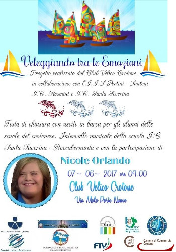 Si conclude mercoledì 07.06.2017 alle 9:00 alla presenza della campionessa Nicole Orlando “Veleggiando tra le Emozioni”, l’ambizioso progetto del Club Velico Crotone, risultato vincitore per la seconda volta, del bando ‘Lo Sport per tutti a scuola’ 2016-2017 per l’avviamento allo sport per studenti con disabilità, lanciato dal Comitato Italiano Paralimpico in accordo con la Fondazione Terzo Pilastro “Italia e Mediterraneo”. L’epilogo consisterà in una “veleggiata con percorso a boe”, di fatto una semplicissima regata da disputare in un clima di divertimento che stempera l’agonismo. Nicole Orlando, quattro ori ai Campionati del Mondo di categoria, citata dal presidente della Repubblica Mattarella nel discorso di fine anno come esempio di positività, protagonista del talent show “Ballando con le Stelle”, non solo interverrà per salutare i velisti che si sono impegnati nel percorso ma anche per presentare il suo libro ‘Vietato dire non ce la faccio’.