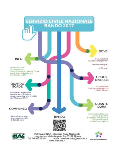 Sono aperte le iscrizioni presso le sedi provinciali dell’INAC-Cia della Calabria fino alle ore 14 del 26 giugno per presentare le domande di partecipazione al bando del Servizio Civile Nazionale approvato dal Dipartimento della Gioventù e del servizio civile nazionale per il progetto promosso dal patronato Inac della Cia della Calabria denominato “Calabria accogliente” (ambito immigrati) che prevede 11 posti disponibili per giovani volontari per 12 mesi presso la sedi regionale e provinciali dell’Inac.