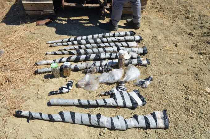 Rimossa una piastra piazzata a mo’ di coperchio, ecco la scoperta: involucri di cellophane nero sigillati con molte volute di nastro adesivo, a proteggere oggetti lunghi o compatti.