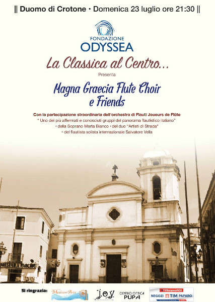 Stasera, due Orchestre flautistichesi si esibiranno da sole e insieme nel centro di Crotone2Stasera insieme per condividere la “bella” musica, l’esibizione di due tra le più affermate orchestre flautistiche del panorama musicale italiano: la “Magna Grecia flute Choir” e la “Joueurs de Flûte” . Le due Orchestre si esibiranno da sole e insieme e vedranno la partecipazione straordinaria del M° Salvatore Vella flautista solista internazionale.
