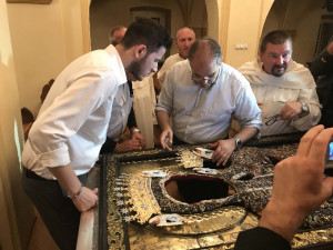 Dopo la conferenza stampa e un momento di squisita ospitalità che i Padri Paolini hanno riservato al Maestro Affidato e al suo staff, la preziosa icona è stata calata dall’altare e adagiata su un piano di lavoro.