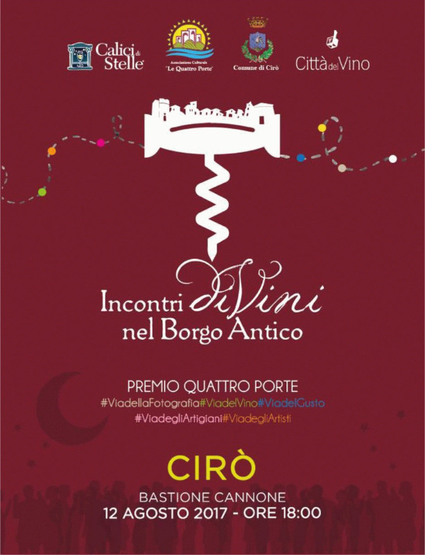 L’evento reduce da uno strepitoso successo della scorsa edizione con l’arrivo di oltre 4 mila visitatori, torna, per far rivivere con il sostegno e la collaborazione del Comune di Cirò, Città del Vino Associazione Nazionale, Movimento Turismo del Vino, Calici di Stelle, la propria storia, le proprie radici, la propria cultura, passando dalla letteratura, arte, musica al buon vino, gastronomia e artigianato. E’ l’occasione questa, per riscoprire e rivalutare il territorio, le attività produttive enogastronomiche locali oltre che far conoscere appieno le risorse culturali e monumentali che possiede la città di Cirò. L’evento è pensato come un vero e proprio cammino enogastronomico, culturale e artistico, laddove percorrendo le vie del borgo si assaporeranno vini pregiati locali, prodotto unico per le sue antiche caratteristiche millenarie, dove esporranno oltre 25 cantine tra le più rinomate del comprensorio Cirotano. Ogni via prenderà un particolare nome: Via del Gusto saranno presenti i migliori prodotti tipici del posto; Via degli Artigiani si potranno apprezzare numerosi manufatti, molti creati appositamente per l’evento e rigorosamente dal vivo; Via degli Artisti si potranno ammirare le capacità creative di oltre 40 Maestri d’Arte e di fotografia.