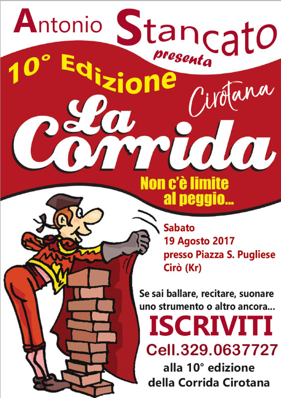 Si apre oggi il sipario sulla Corrida di Cirò, giunta alla sua decima edizione, un grande spettacolo grazie al direttore artistico e super presentatore Antonio Stancato, un vero mattatore della varietà il “Checco” cirotano. Una grande manifestazione che ogni anno attira centinaia di turisti da tutto il comprensorio, per vedere i numerosi partecipanti della corrida. Nel corso della manifestazione tra i tanti ospiti ci sarà la campionessa nazionale di Dance, Matilde Macinai che ha partecipato ai mondiali con un ottimo posto, di Sesto Fiorentino (Firenze), di origine cirotana, visto che la mamma la docente Caterina De Fine è di Cirò. La giovane artista recentemente è stata al programma Sotto le stelle di Milly Carlucci. Hai girato di recente un film che uscirà nelle sale cinematografiche a Novembre, girato a Pietrasanta dove la troupe cinematografica capitanata dal regista Dado Martino per la realizzazione del film lungometraggio dal titolo 8 minuti ha visto protagonista Pippo Franco.