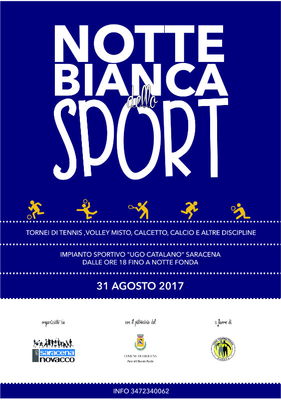 Tornei di tennis, volley misto, calcetto, calcio e altre discipline. È tutto pronto per la 1° edizione della NOTTE BIANCA DELLO SPORT. Il ricavato sarà devoluto in beneficienza.