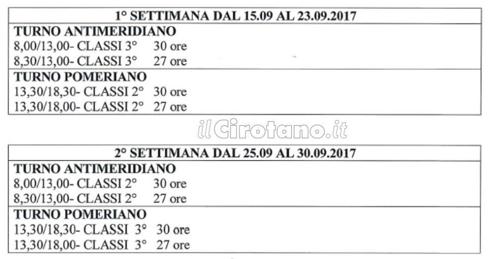 Il Dirigente Prof. Giuseppe Barberio dell’Istituto Scolastico Comprensivo “Filottete” Avvisa i Genitori solo delle Classi Seconde e Terze di Scuola Primaria del plesso “Ferrari’ che, sentiti i rappresentanti dell’Amministrazione Comunale ed il Presidente del Consiglio di Istituto, a decorrere dal 15 settembre 2017: