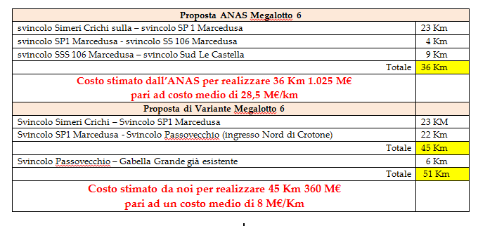 Pertanto, con 360 M€ si avrebbero ben 51 Km di nuova SS 106 di Superstrada veloce a 110 Km/h Extraurbana Principale di 1° categoria, lasciando inalterato l’attuale tracciato già messo in sicurezza per il traffico leggero, turistico e agricolo.