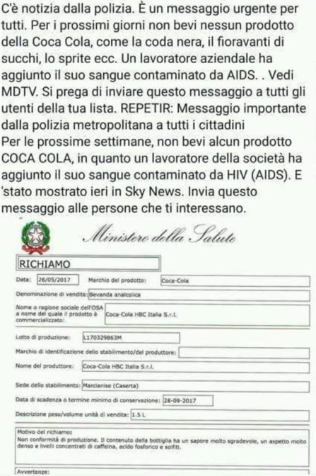 Ancora bufale online che vanno a colpire note multinazionali, che lo “Sportello dei Diritti” ritiene utile segnalare. L’ultima boutade telematica è stata comunicata sul sito della Polizia di Stato tramite un post pubblicato su “Commissariato di PS On Line – Italia”. Nel mirino, questa volta la Coca Cola con un messaggio che in un italiano stentato invita a non consumare alcun prodotto del colosso delle bibite con il tentativo di renderlo credibile mediante la pubblicazione di un fantomatico avviso di richiamo del Ministero della Salute che è visibile nella fotografia che alleghiamo. Questo il testo dell’allerta della Polizia Postale:” BUFALA ALLA #COCACOLA. Svariate segnalazioni ci portano alla nostra attenzione questo messaggio che se pur allarmante risulta privo di ogni fondamento. Cerchiamo di valutare quali messaggi condividere e quali cestinare. Con un minimo di buon senso possiamo limitare questo fenomeno.”. Ovviamente, rileva Giovanni D’Agata, presidente dello “Sportello dei Diritti” si tratta di una vera e propria bufala, in quanto i richiami dei prodotti alimentari sono tutti verificabili nei siti istituzionali.
